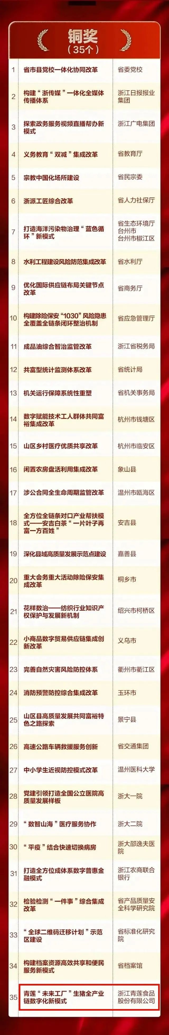 重磅!青蓮食品—膳博士榮獲浙江改革突破獎(jiǎng)銅獎(jiǎng)! 2023-02-02 08:37:26 浙江青蓮食品股份有限公司 瀏覽次數(shù) 7923 近日,浙江省委改革辦公布了2022年度浙江省改革突破獎(jiǎng)名單。浙江青蓮食品股份有限公司“數(shù)智青蓮”未來工廠榮獲2022年度浙江省改革突破獎(jiǎng)銅獎(jiǎng),是銅獎(jiǎng)組中唯一的一家民營企業(yè)。20多年來,青蓮食品構(gòu)建起從農(nóng)場到餐桌的透明全產(chǎn)業(yè)鏈,在改革創(chuàng)新中以種業(yè)為源頭,建立起未來農(nóng)場—未來工廠—產(chǎn)業(yè)新零售等數(shù)字化應(yīng)用,真正從用戶需求出發(fā)為社會提供優(yōu)質(zhì)食品!此次獲得浙江改革突破獎(jiǎng)銅獎(jiǎng),更是對青蓮食品數(shù)字化轉(zhuǎn)型成果的肯定和勉勵(lì)!實(shí)現(xiàn)黑豬專家膳博士在安全和美味雙升級上硬核突破!身為黑豬專家,膳博士服務(wù)過世博會、世乒賽、國際馬拉松比賽,連續(xù)8年為世界互聯(lián)網(wǎng)大會供肉,連續(xù)14年為中國極地研究中心供肉,成為杭州亞運(yùn)會官方生鮮肉類產(chǎn)品供應(yīng)商。以國家級嘉興黑豬和兩頭烏保種場作為種業(yè)基礎(chǔ)繁育國家級優(yōu)質(zhì)新品種,形成完整的黑豬商品體系為消費(fèi)者帶來舌尖體驗(yàn)。近年來,通過智慧養(yǎng)殖為傳統(tǒng)畜牧產(chǎn)業(yè)數(shù)字化轉(zhuǎn)型先行探路,以新一代信息技術(shù)為手段,重塑生豬全產(chǎn)業(yè)鏈生產(chǎn)組織方式和管理服務(wù)模式,構(gòu)建“1+4+N”模型,推動(dòng)全產(chǎn)業(yè)鏈數(shù)字化轉(zhuǎn)型。產(chǎn)業(yè)零售端以用戶需求為中心持續(xù)推出膳博士黑豬鮮肉鮮制系列產(chǎn)品提升消費(fèi)體驗(yàn),滿足國人對美好生活、品質(zhì)食品的向往。2022年,青蓮智慧牧場首批入選浙江省“未來農(nóng)場”,“數(shù)智青蓮”未來工廠獲全省數(shù)字化改革“最佳應(yīng)用”和全省數(shù)字經(jīng)濟(jì)系統(tǒng)“最佳應(yīng)用”。在全省數(shù)字化改革大會上做匯報(bào)演示,列入全省數(shù)字經(jīng)濟(jì)系統(tǒng)地方特色應(yīng)用目錄,受到央視、省級、市縣級等媒體持續(xù)關(guān)注報(bào)道。 上一條“風(fēng)云浙商”許明曙:人生把一件事做好就很不容易 下一條全國唯一!膳博士·香雪白豬獲2022年度國家新品種認(rèn)定!